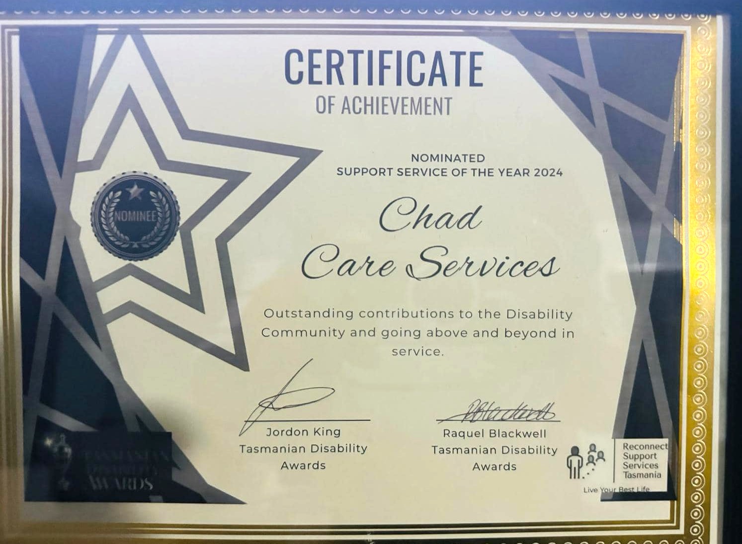 CHAD Care Services was honored to be nominated for Best Support Service of the Year at the Tasmanian Disability Awards 2024. This recognition highlights our team’s dedication to providing exceptional, person-centered disability support services.